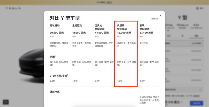 需要證據的少量是,這里的續航,應該是基于好意思國EPA工況測試的,跟國內的CLTC工況是不太一樣的,為了有個直不雅的對比,我去查了一下特斯拉Model Y北好意思版的續航,相同是售價在4.8萬好意思元,且座椅為7座布局的特斯拉Model Y,EPA工況下的續航里程為327英里,換算成公里數的話是526km。